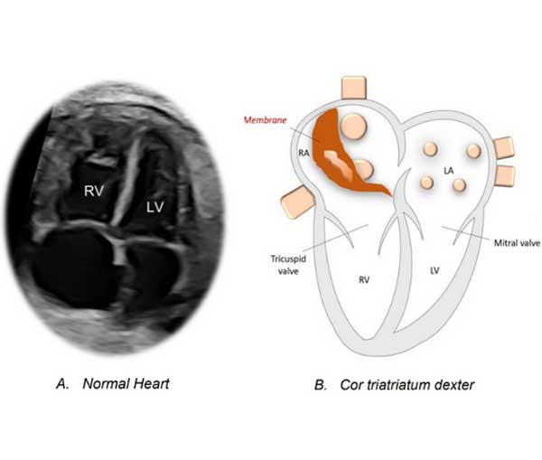 The normal heart is divided into four chambers, two atria: right and left, and two ventricles: right and left. Blood normally passes from the atria to the ventricles, and then to the lungs and the rest of the body. A CTD occurs when a membrane divides the right atrium into two compartments. This membrane can hinder the passage of blood from the right atrium to the right ventricle.